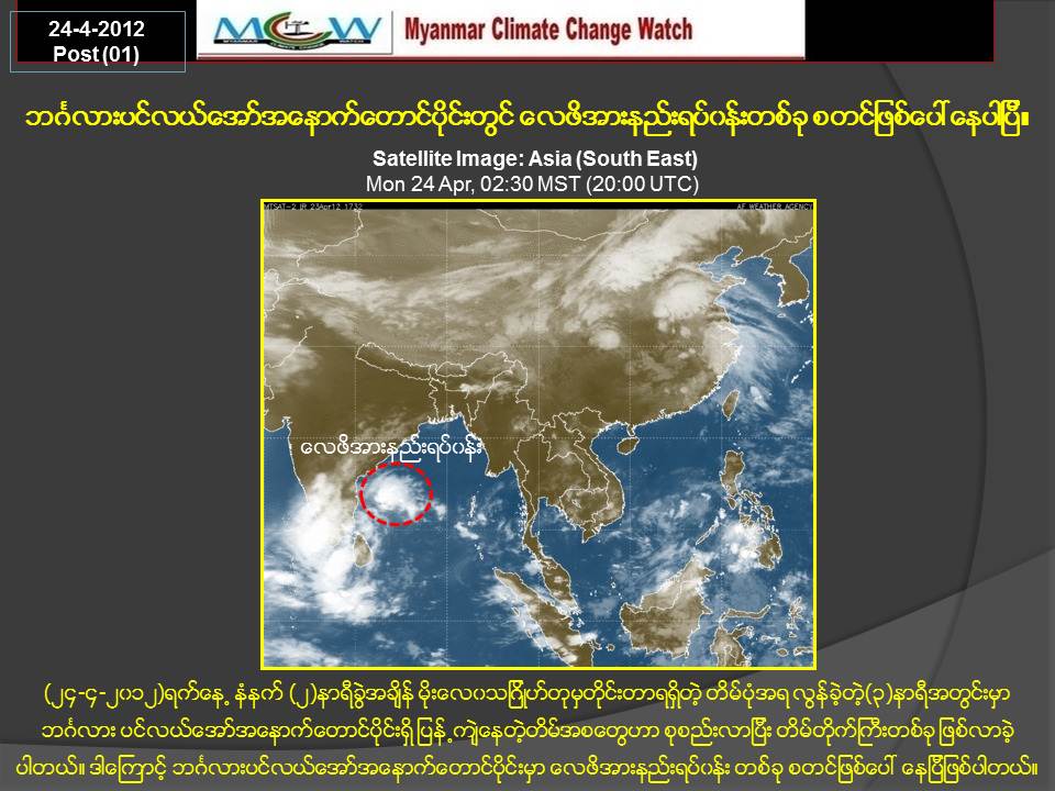 ဘာဘဲေျပာေျပာ ျမန္မာျပည္အတြက္ေတာ့ အႏၱရာယ္ေပးဖို႕ အမ်ားႀကီး လိုပါေသးတယ္။ အေရွ႕ေျမာက္ဖက္ကို ေမ်ာပါလာရင္ေတာ့ (၂၈-၂၉) ရက္ေန႕ေလာက္မွာ မုန္တိုင္းငယ္တစ္ခုျဖစ္လာႏိုင္ပါတယ္။ ဒီလိုဆိုရင္ေတာ့ ဘဂၤလားေဒ့ရွ္ နဲ႕ ရခိုင္ေျမာက္ပိုင္းစြန္းကမ္းေျခေတြ ကို ေစာင့္ႀကည္႕ရ ပါလိမ့္မယ္။ ျမစ္၀ကြ်န္းေပၚေဒသနဲ႕ေတာ့ မပတ္သက္ႏိုင္ဘူးလို႕ ခန္႕မွန္းရပါတယ္။
